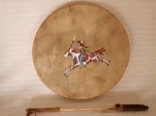 En provenance de la Réserve de Pine Ridge après notre Voyage du mois de Juin 2007, et dans le cadre de notre Partenariat avec les Jeunes Artistes Lakȟóta "La Société des Enfants Bison", nous vous proposons ces 3 Tambours avec bâton, d'un diamètre de 38 cm. Ces Tambours sont des pièces uniques !