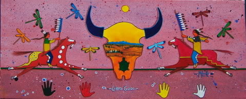 Cette toile intitulée "Le Guide Lakȟóta" est une peinture acrylique, de 40cm x 100cm,