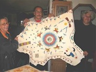 Contrairement à Charley, Merle tient absolument à être pris en photo à nos côtés avec son oeuvre ! Nous lui en sommes reconnaissants car nous le considérons Jean-Louis et moi comme un Artiste exceptionnel dont les œuvres s’inscrivent dans le temps et l’histoire de son Peuple. C’est pour nous un honneur ! Et c’est pour cette raison que nous tenons à vous faire partager notre émotion, notre admiration pour Merle, traditionaliste Lakota qui en plus d’être un être au talent incontestable est un homme de cœur, un homme qui veut pour la jeunesse Lakota, ce dont il a été privé : une structure où l’art typique Lakota pourra s’affirmer dans toute sa légitimité et sa beauté, et où quelques jeunes pourront peut être sortir de l’anonymat de la Réserve et devenir des peintres émérites !