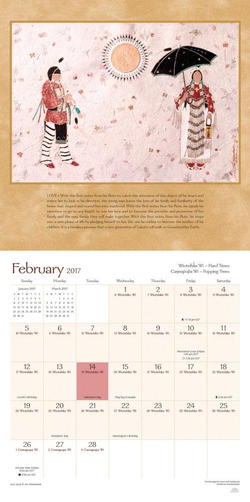 Le Calendrier Lunaire Lakȟóta est présenté avec le Calendrier Standard et comprend les noms Lakȟóta pour les mois, tels que "When Geese Return" — Quand les oies reviennent — et "When Leaves Fall" — Quand les feuilles tombent —.